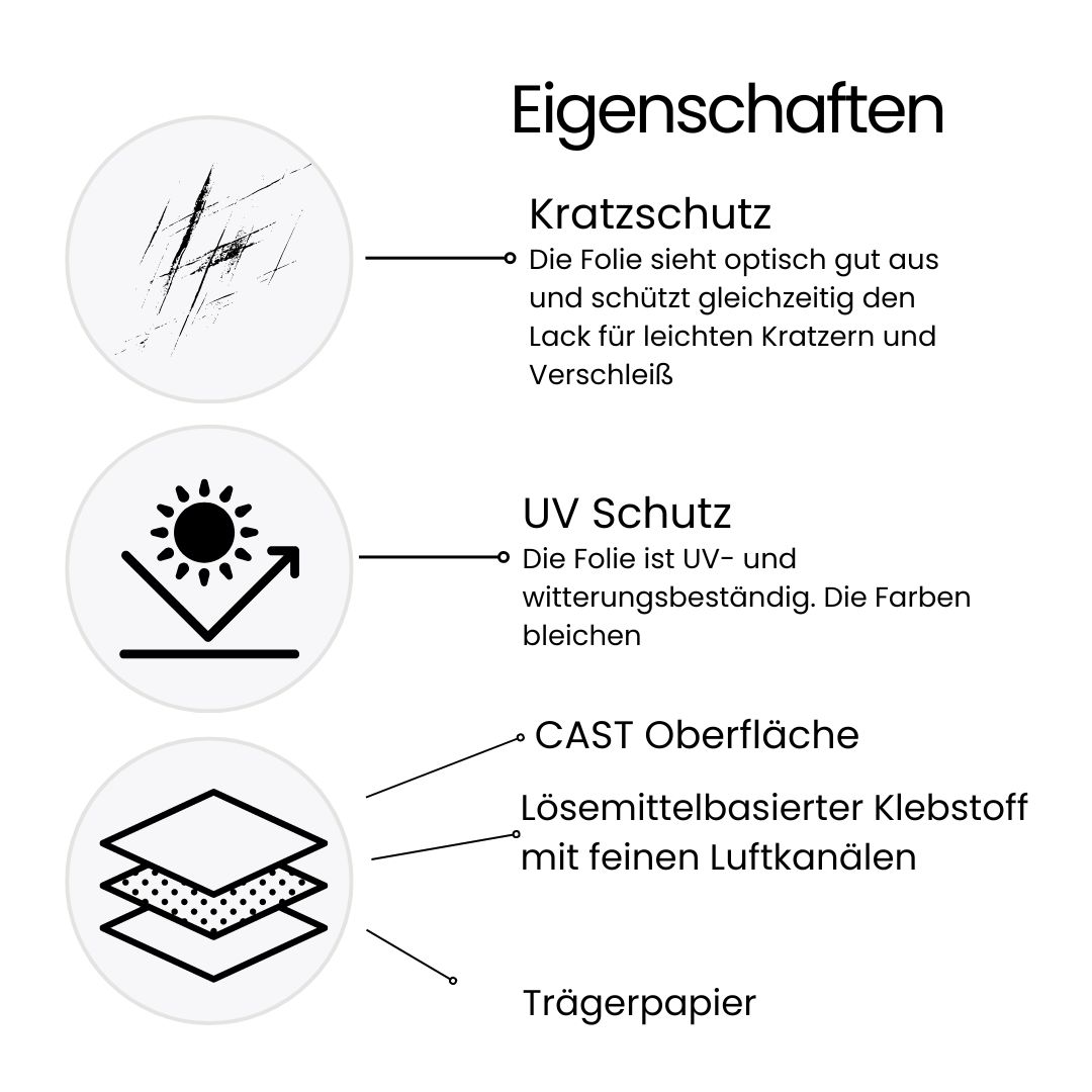 - Glanz schwarze Oberfläche: Diese hochwertige Folie ist extrem widerstandsfähig gegen Witterungseinflüsse, UV-beständig und schützt vor Kratzern und Abnutzung. Sie sorgt für ein langlebiges, tiefglänzendes Finish, das den Look Ihres Fahrzeugs aufwertet und ihm eine moderne, elegante Ausstrahlung verleiht.