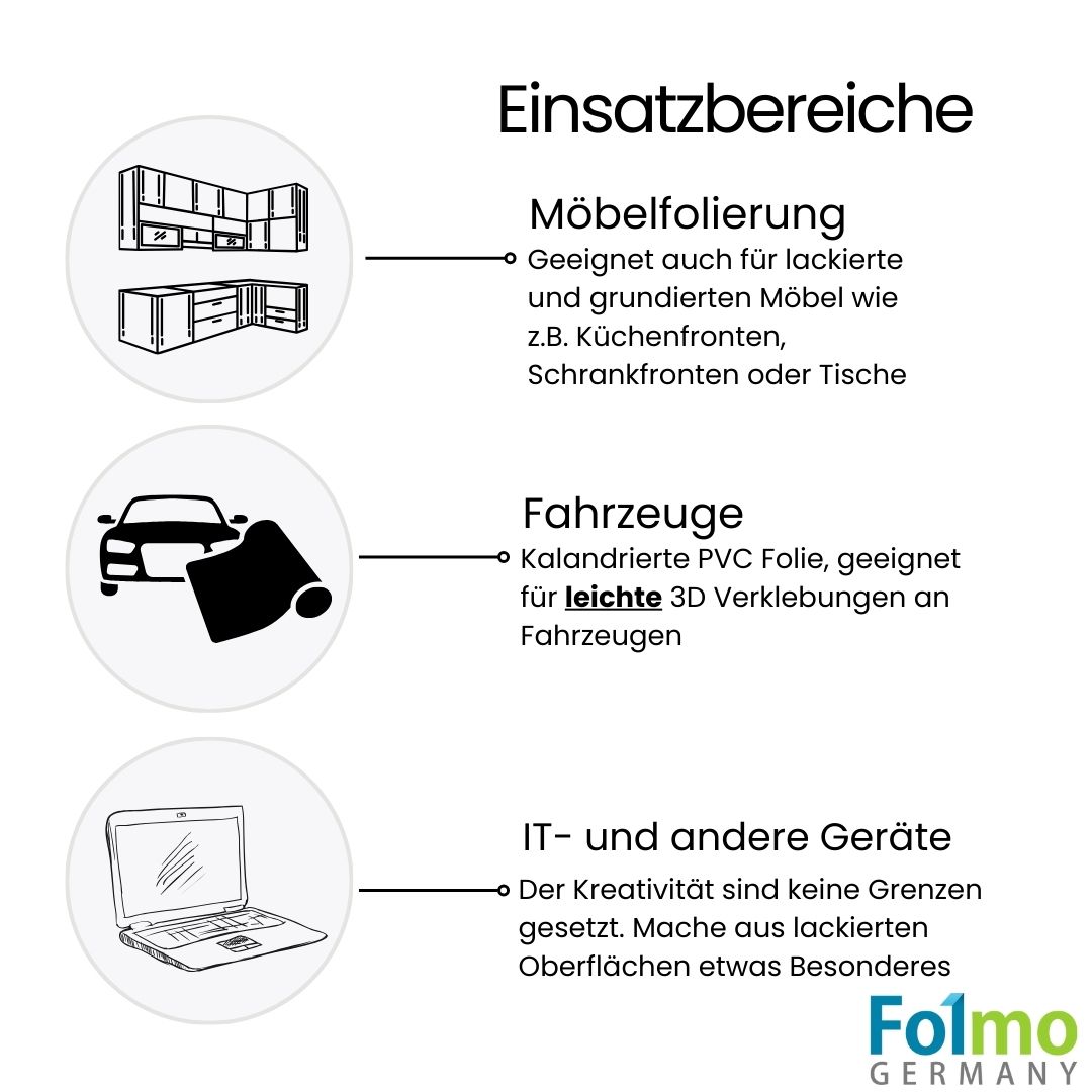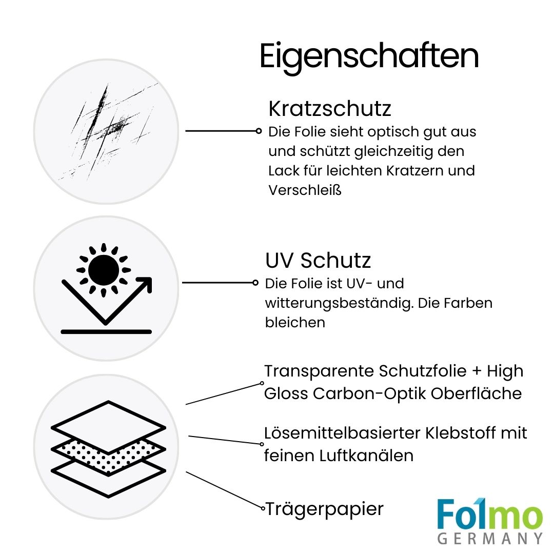 - Vielseitige Anwendungsmöglichkeiten: Die Folmo glänzende 5D Carbonfolie ist sowohl für den Innen- als auch den Außenbereich des Fahrzeugs geeignet. Sie kann auf verschiedene Fahrzeugtypen angewendet werden und bietet eine kostengünstige Möglichkeit, das Design Deines Fahrzeugs individuell zu gestalten.