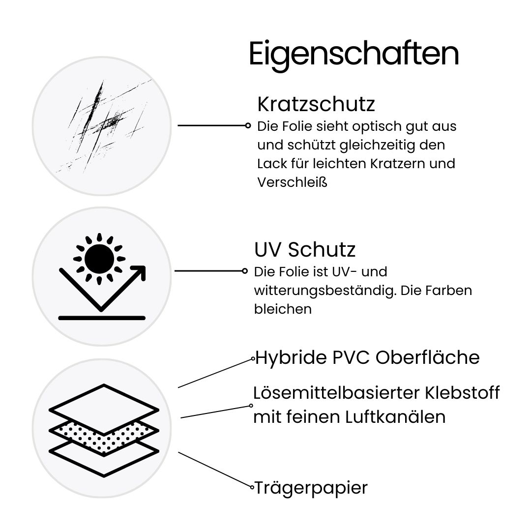 - Glanz schwarze Oberfläche: Diese hochwertige Folie ist extrem widerstandsfähig gegen Witterungseinflüsse, UV-beständig und schützt vor Kratzern und Abnutzung. Sie sorgt für ein langlebiges, tiefglänzendes Finish, das den Look Ihres Fahrzeugs aufwertet und ihm eine moderne, elegante Ausstrahlung verleiht.